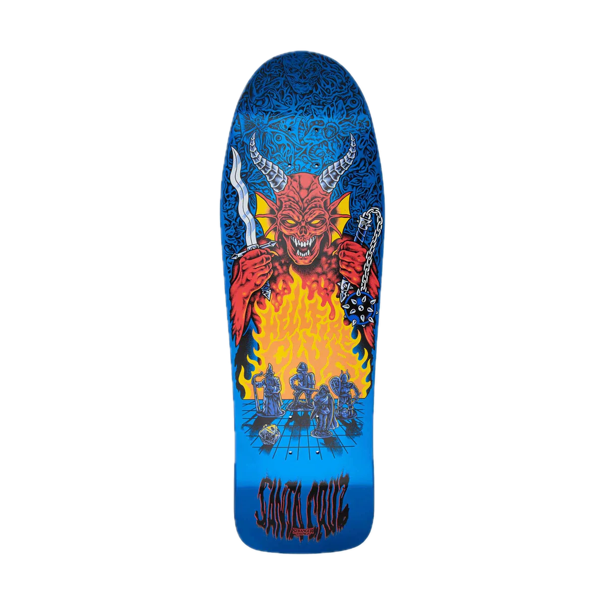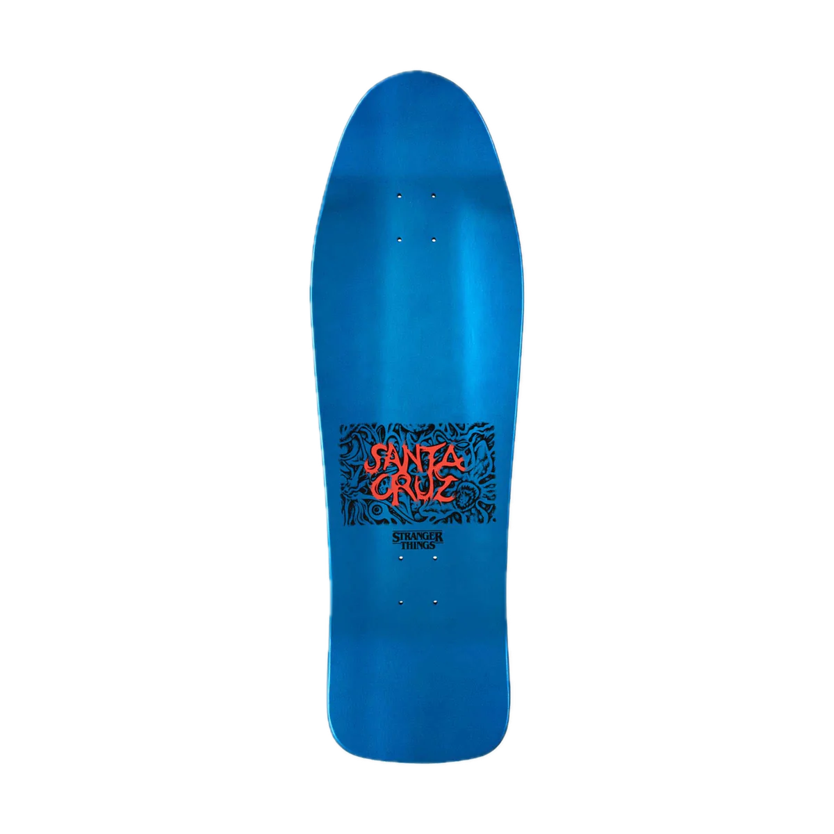 The Santa CruzStranger Things Meek Slasher Eddie 10.1in x 31.13in deck featuresmulticolor glow in the dark graphics on Keith Meek's classic Slasher shape.