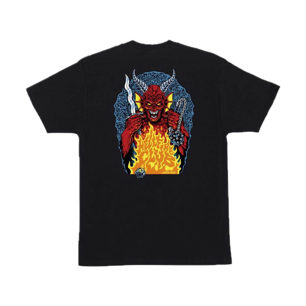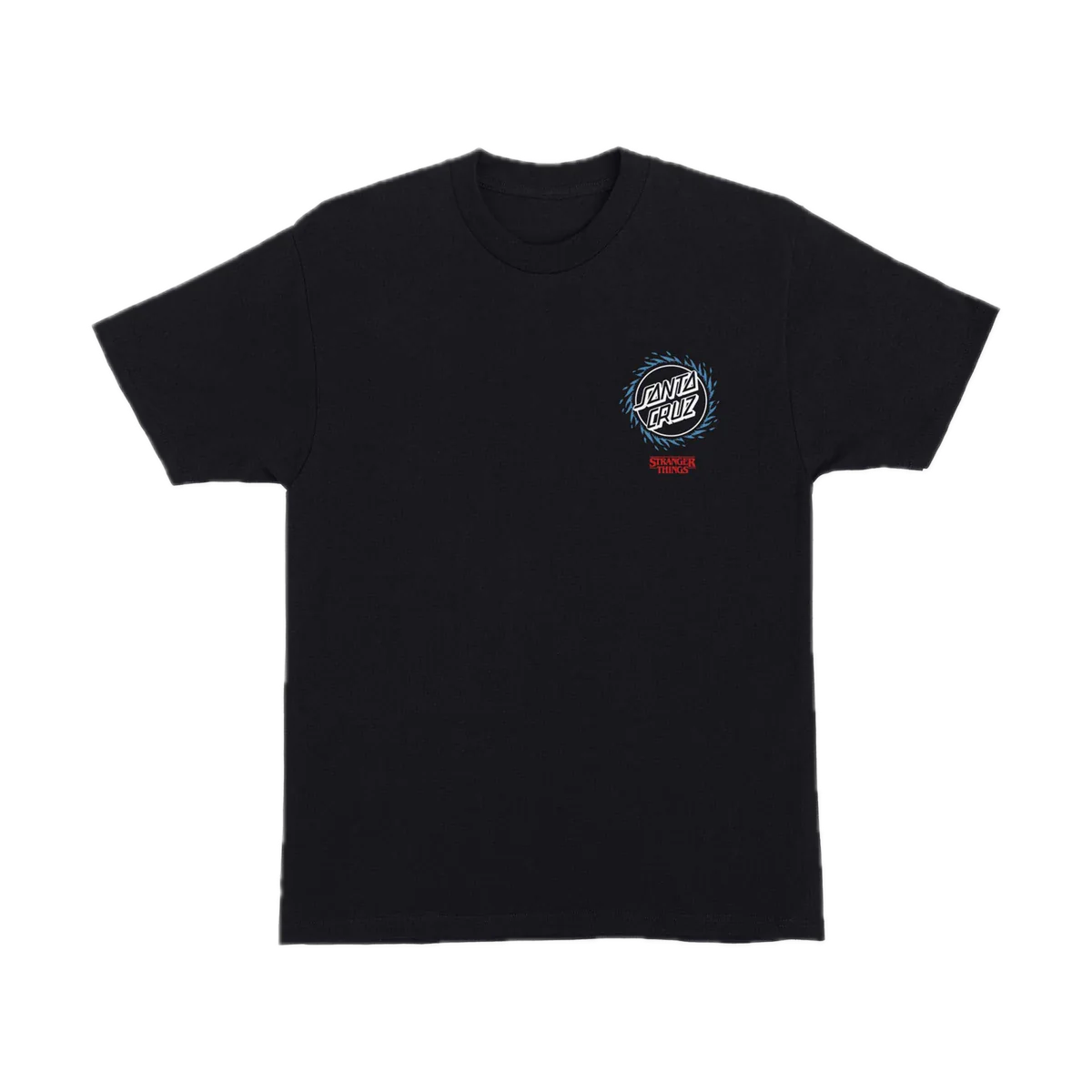 The Santa Cruz Stranger Things Hellfire Pit men's short sleeve regular fit t-shirt features small front and large back Santa Cruz x Stranger Things Hellfire Pit artwork; printed in soft hand ink.